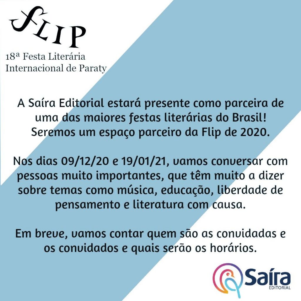 A Saíra Editorial estará presente como parceira de uma das maiores festas literárias do Brasil! Seremos um espaço parceiro da Flip de 2020. Nos dias 09/12/20 e 19/01/21, vamos conversar com pessoas muito importantes, que têm muito a dizer sobre temas como música, educação, liberdade de pensamento e literatura com causa. Em breve, vamos contar quem são as convidadas e os convidados e quais serão os horários.